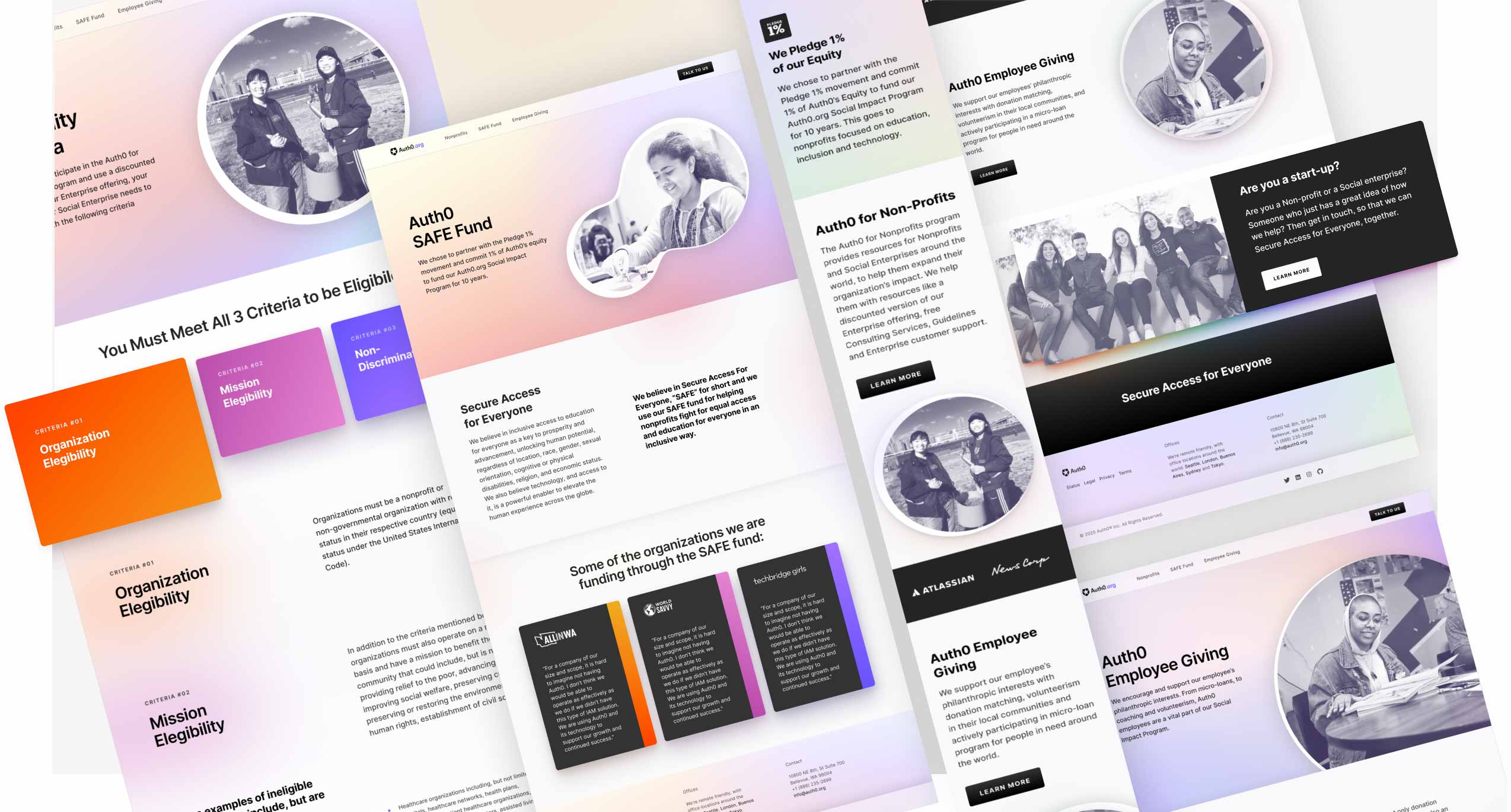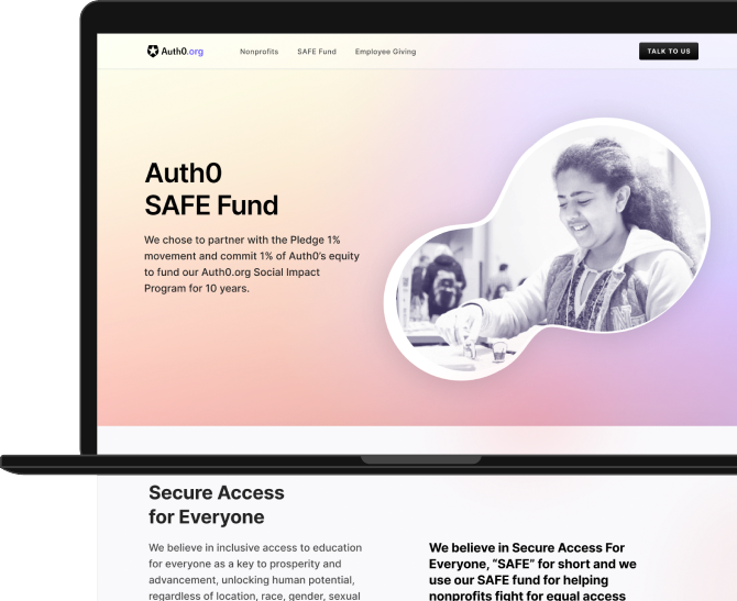 In order to allocate part of their equity to nonprofit organizations, Auth0 partnered with the Pledge 1% movement. This action formalized their social impact project with the Auth0 SAFE Fund. Our job during this project was to find a distinguishable look & feel for this program's landing page, in between the Auth0 brand.