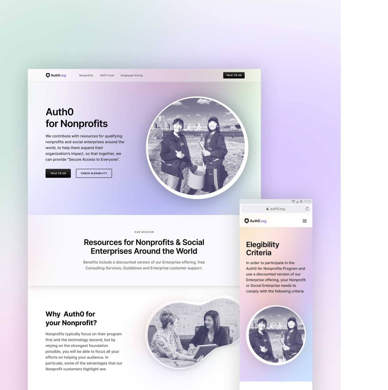 Auth0’s social impact domain has its own new visual identity inside their main brand. All the relevant information, such as the current nonprofits they support and the eligibility criteria to participate in this program are displayed on the website.