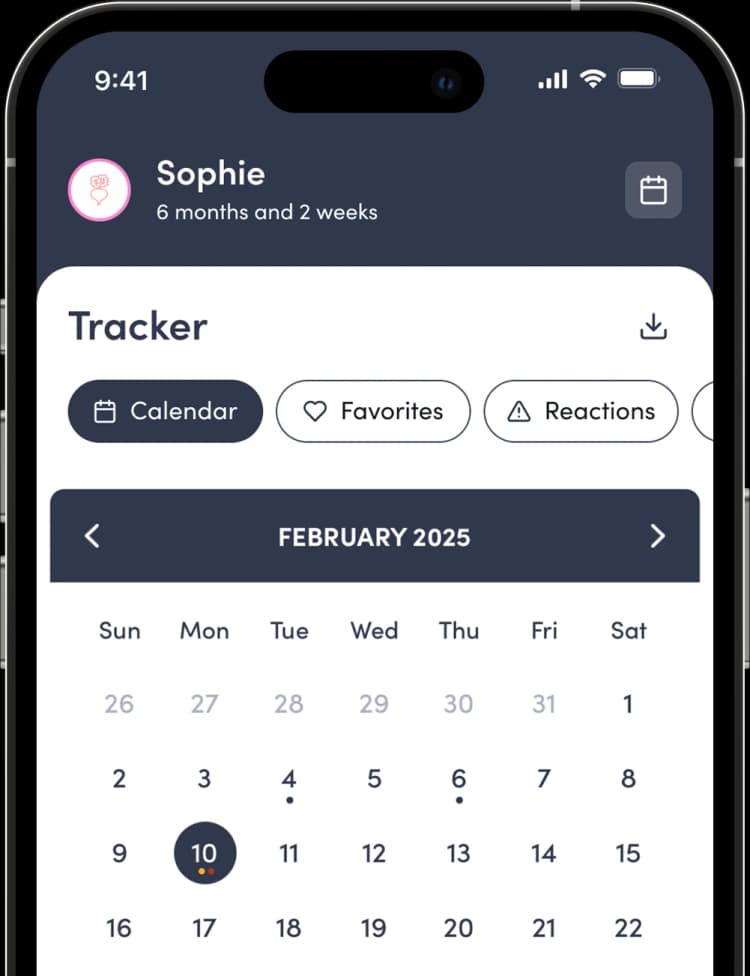 Log foods introduced, including common allergens, reactions and sensitivities with smart tracking tools.